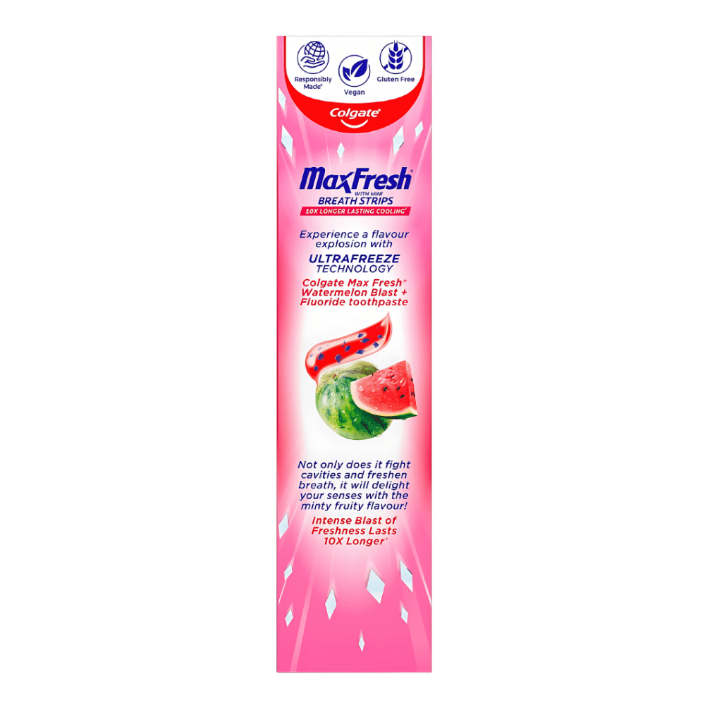 Experience flavour that wakes you with Colgate Max Fresh Watermelon Blast + Fluoride toothpaste with mini breath strips.