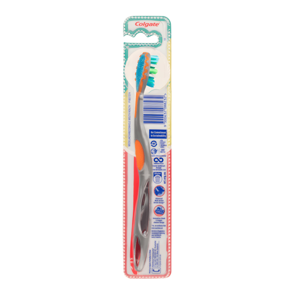 Colgate 360 Advanced Whole Mouth Health Manual Toothbrush is designed with multi action bristles for effective plaque removal with an innovative tongue & cheek cleaner design.