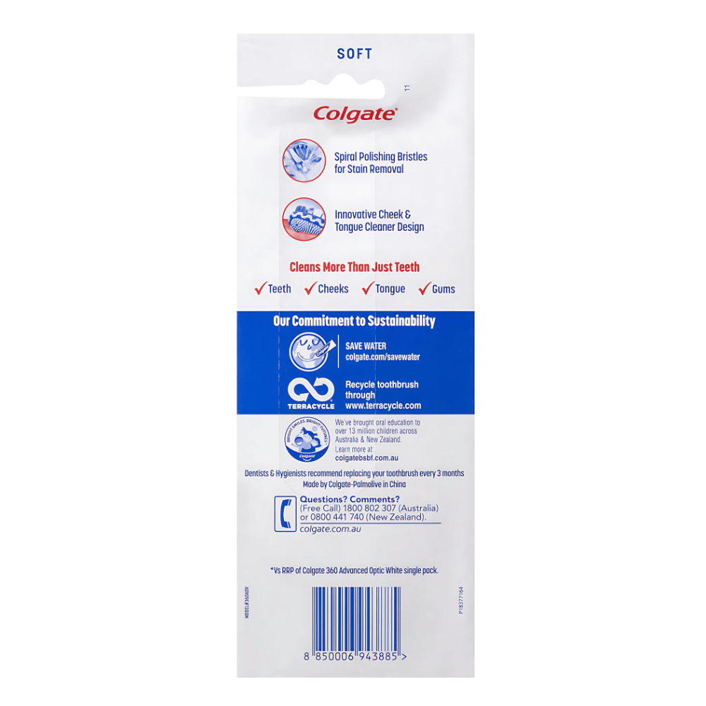 Colgate 360 Advanced Whole Mouth Clean Optic White Toothbrush is made with soft spiral, polishing bristles for stain removal and naturally whiter teeth. Buy 3 get 1 FREE*!