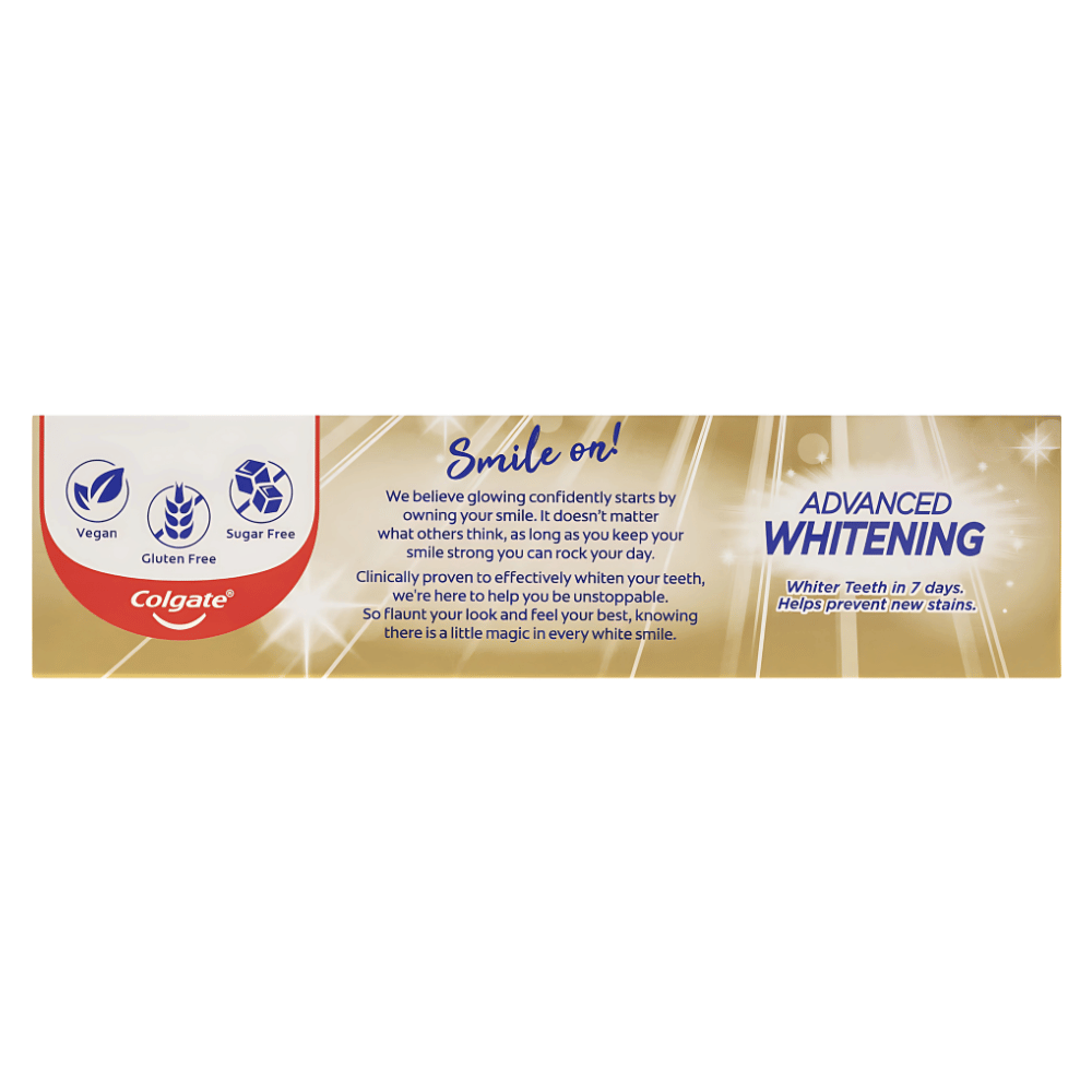 Colgate Advanced Whitening Tartar Control Toothpaste is sugar free, gluten free and vegan. Made in a recyclable tube (does not include cap).