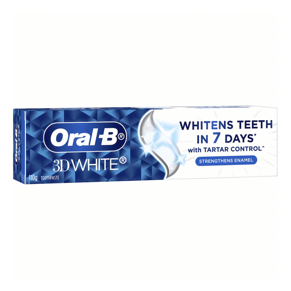 Oral-B 3DWhite Strengthens Enamel toothpaste contains our unique whitening formula that whitens teeth in 7 days* with tartar control^.