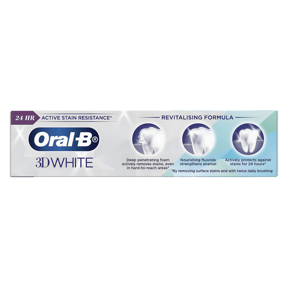 Oral-B 3DWhite Lasting White Toothpaste is clinically proven to remove up to 100% of stains* and provide 24 hour active stain resistance** Oral-B 3DWhite Lasting White Freshness Blast Toothpaste is peppermint flavoured to provide freshness during and after brushing. Oral-B is the #1 Toothbrush brand used by dentists worldwide.^ *by removal surface stains **against surface stains with twice daily brushing ^based on surveys of a representative sample of dentists’ usage carried out for P&G continuously