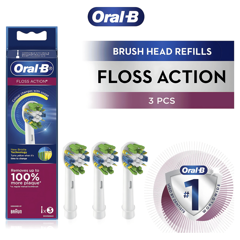 New Bristle Technology: Oral-B Floss Action brush head turns from green to yellow, indicating when it is time to change. Features MicroPulse bristles that help provide a superior deep clean between teeth*. The bristles on the round brush head are designed to clean deep between teeth to remove up to 100% more plaque leaving your whole mouth cleaner than a regular manual toothbrush