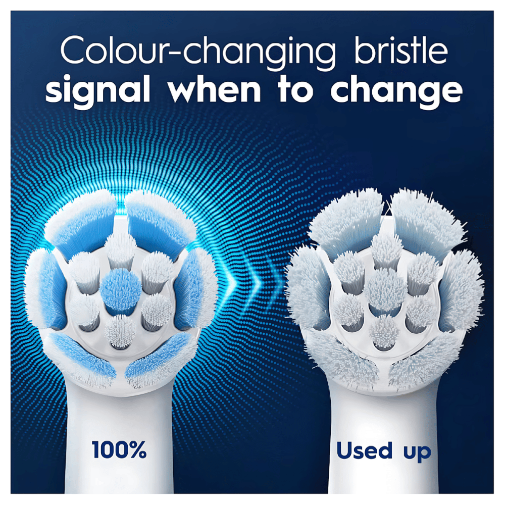 The bristles are carefully arranged on the typical Oral-B round head to better surround each tooth for optimal cleaning