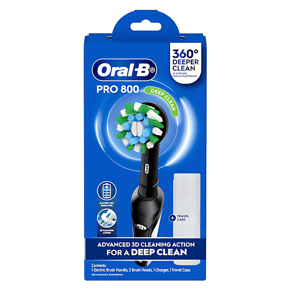 Oral-B PRO 800 Deep Clean is clinically proven to remove 100% more plaque* provide a deep clean. Features Oral-B NEW Bristle Technology Cross Action Brush Head: Green bristles turns yellow signalling when to change. Pressure Sensor: Brush alerts you when brushing too hard. *vs regular manual toothbrush# oral-b # electric toothbrush # toothbrush