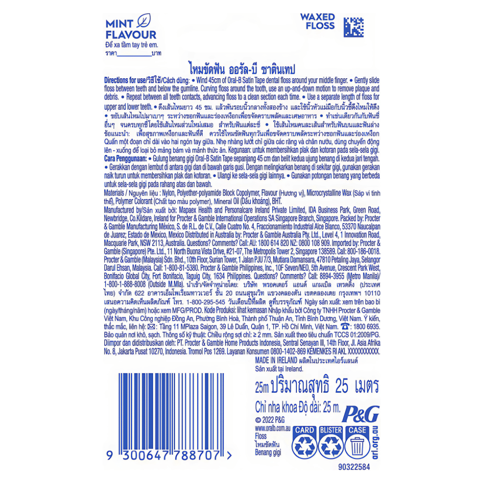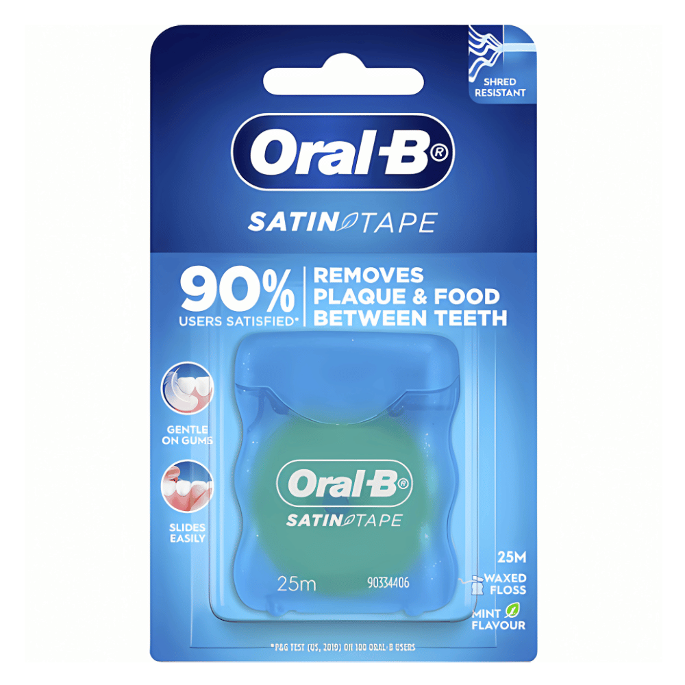 Oral-B Satin Tape Waxed Mint 25m removes plaque and food stuck in between teeth where all toothbrushes cannot reach. It is shred resistant, slides easily and gentle on your gums so that you can get a complete clean in your mouth# Oral-B # toothbrush # toothpaste # electric toothbrush # mouthwash # Whitestrips # Replacement Head # floss # whitening # fresh # Clean # Sensitive