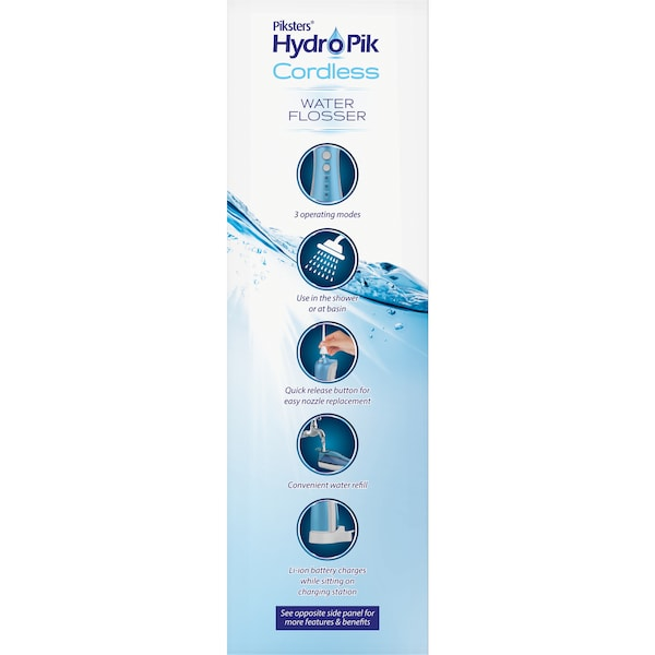 Piksters Hydropik Water Flosser is a powerful cordless water flosser. Water flossing has been shown to remove 99.9% of plaque from treated areas. This is especially useful in hard to reach places.