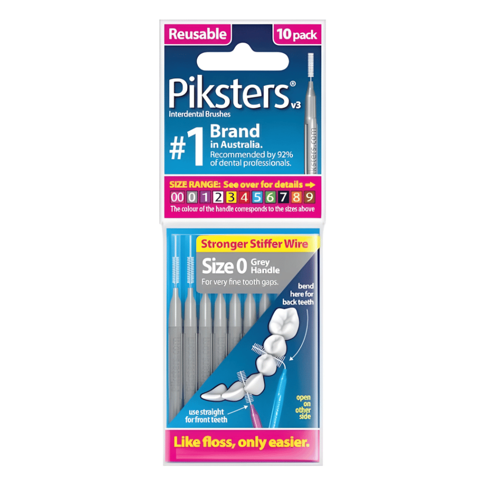 Piksters Interdental Brushes easily get into and clean tight areas of the mouth where a toothbrush cannot reach. The spaces between teeth can conceal parts of the tooth surface, by cleaning in the spaces you get the advantage of helping reduce decay. These small size 0 brushes are ideal for very fine tooth gaps and inside gum pockets. Each brush features an extended grey handle and a flexible head for easy access to your molars and comfortable cleaning at any angle. The brush head consists of strong & stiff plastic-coated wire covered in soft, space-filling bristles to effectively trap and scrub away food particles and dental plaque.