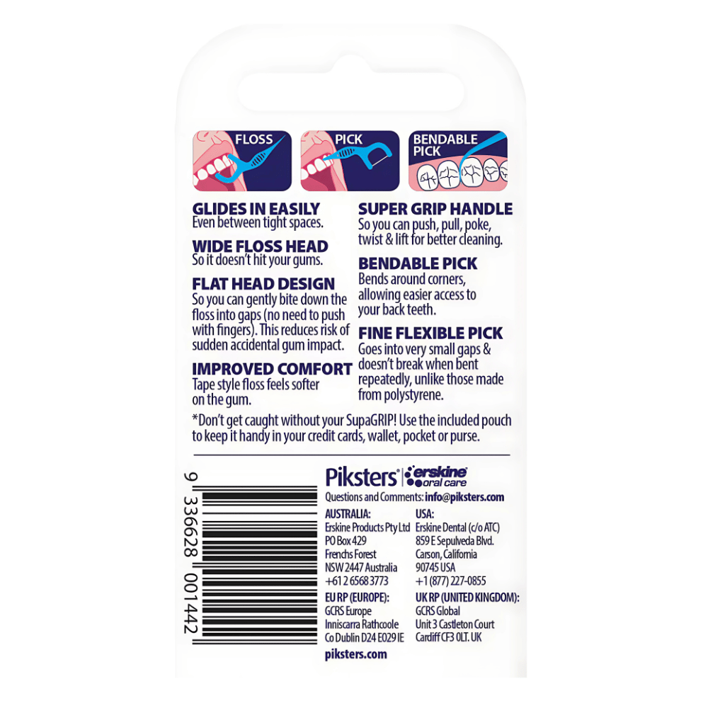 Piksters SupaGRIP 2 in 1 floss picks, perfect for flossing and picking, to keep your teeth and gums clean and free from harmful plaque. Piksters SupaGRIP features a stronger floss, bigger handle and tougher toothpick for an overall superior, more durable design. Includes a reusable pouch to store a floss pick in your wallet, pocket or handbag.