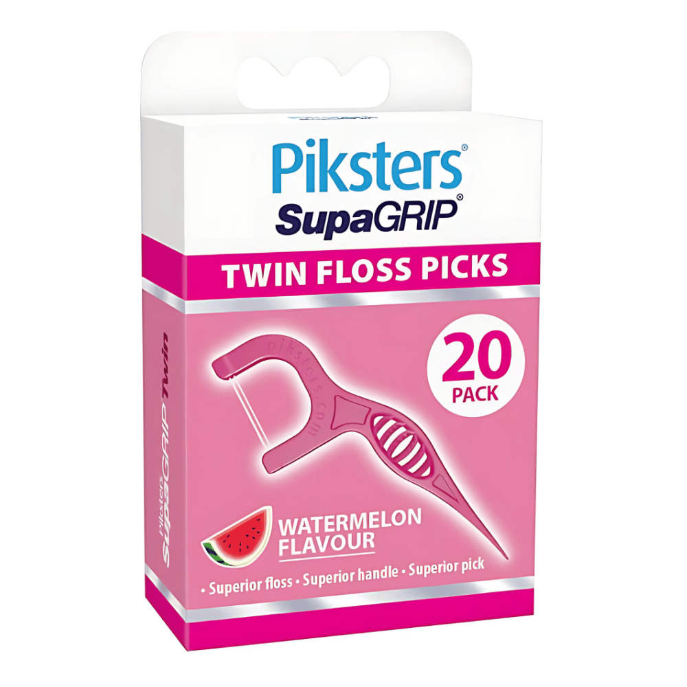 Piksters SupaGRIP Twin Watermelon Floss Picks feature double-stranded floss to remove plaque and food debris. Designed with a superior grip handle and flexible pick, they provide precise control for cleaning tight spaces and back teeth. Pair with other products in the range for 360 mouth clean!