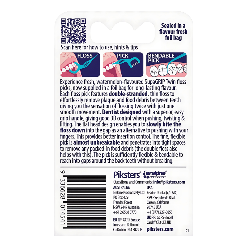 Piksters SupaGRIP Twin Watermelon Floss Picks are packaged in a foil bag for long-lasting flavour. Each pick features double-stranded, thin floss that effortlessly removes plaque and food debris between teeth, giving you the sensation of flossing twice with one smooth motion.