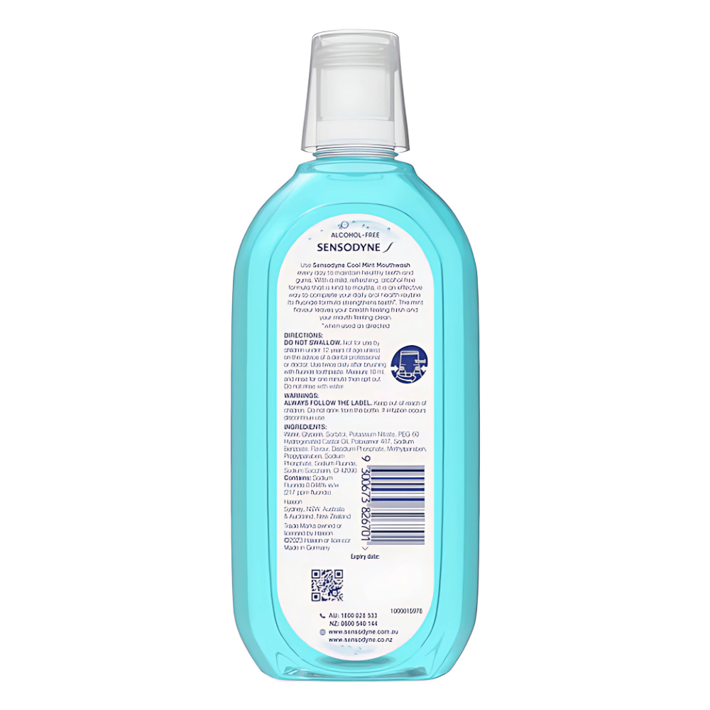 Use Sensodyne Cool Mint Gentle Mouthwash everyday to maintain healthy teeth and gums. With a mild, refreshing, alcohol free formula that is kind to mouths, Sensodyne Sensitive Cool Mint Gentle Mouthwash is an effective way to complete your daily oral health routine. Its fluoride formula strengthens teeth. The mint flavour mouthwash leaves your breath feeling fresh and your mouth feeling clean.