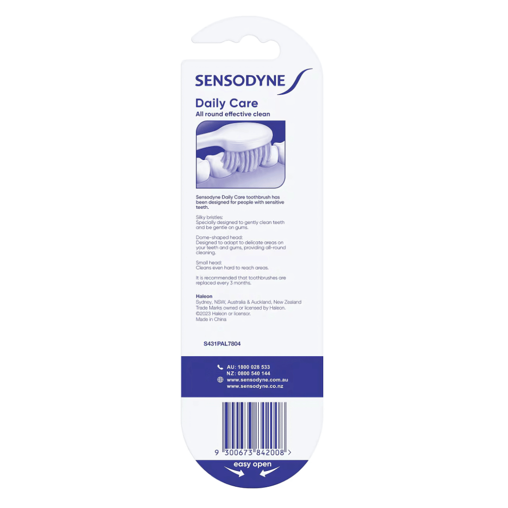 Sensodyne Daily Care Toothbrush provides an all around effective clean. Cleaning effectively is important for people with sensitive teeth to help avoid a build-up of plaque and to help minimise further tooth wear. Our Sensodyne Daily Care Toothbrush has been specifically designed for people with sensitive teeth.It features round-ended bristles and a dome-shaped head and a small head designed for better access.