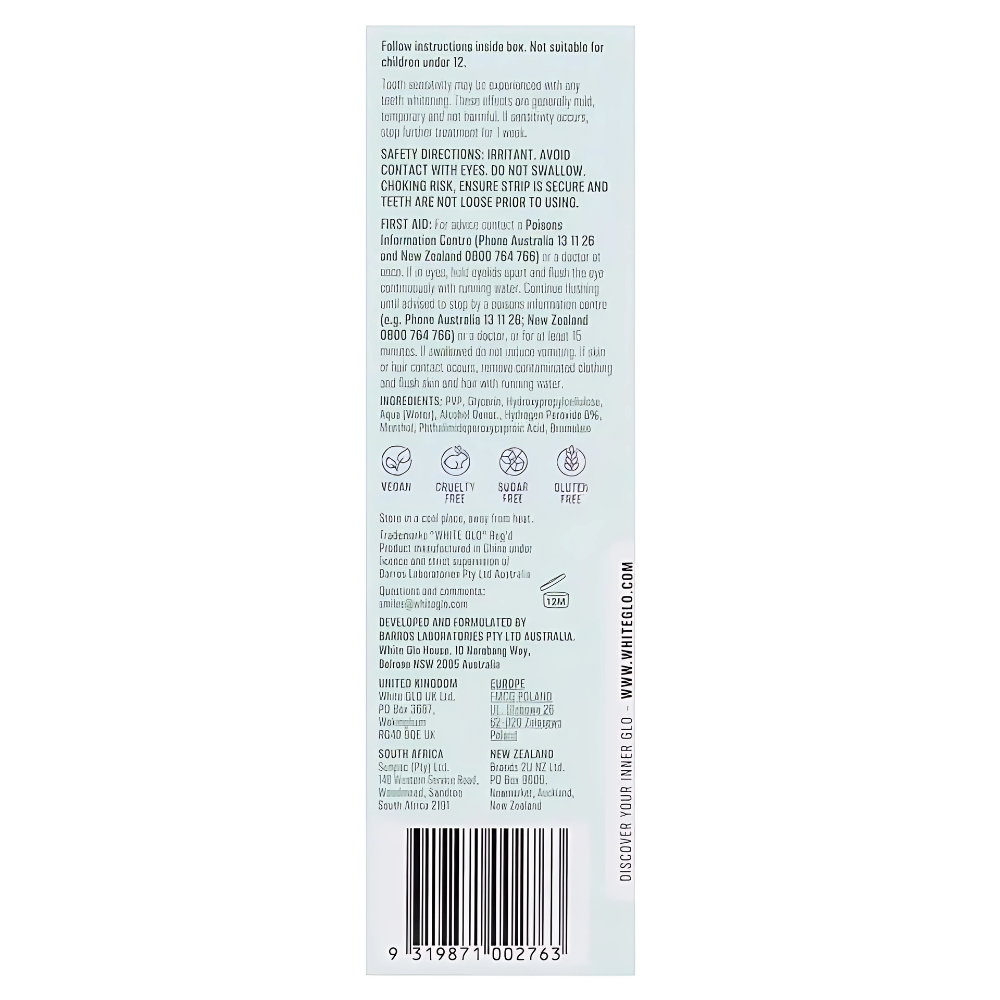 White Glo’s Advanced Whitening Strips will give you professional results in the comfort and convenience of your own home. Simply apply the strips to your teeth and go about your usual activities, then remove after an hour for advanced results. Each strip contains 3 advanced active whitening ingredients to deliver you an even more impressive whitening result. This exclusive formulation has been developed by Australian Cosmetic Dentists and incorporates peroxide, PAP and Natural Enzymes to target tough stains caused by general aging, coffee, wine or smoking.