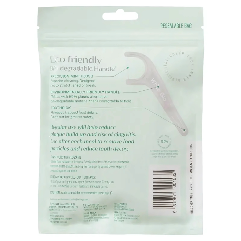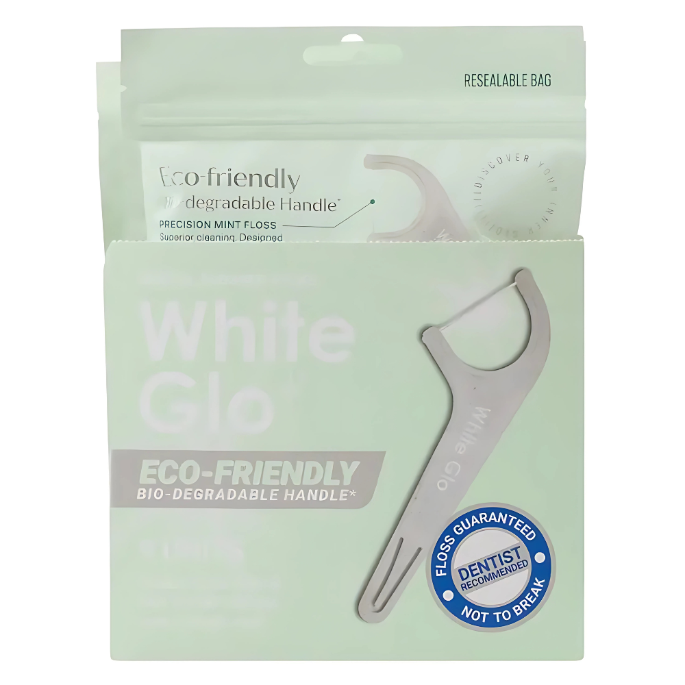 White Glo Eco-Friendly Floss Picks Mint freshens breath and has a biodegradable handle (Made with 60% plastic alternative biodegradable material that’s comfortable to hold).
