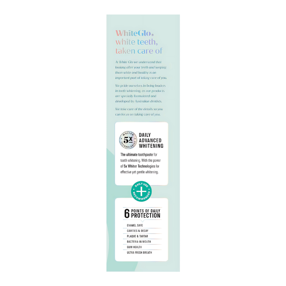 White Glo’s expert team has incorporated 5 clinically proven whitening technologies in one toothpaste. Each one of White Glo’s toothpastes give you all the benefits of a regular toothpaste, with 6 different points of daily protection, making it safe to use everyday.