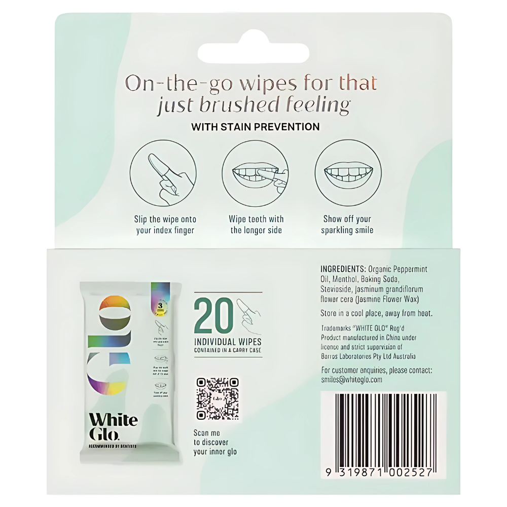 White Glo’s Teeth Wipes are an innovative and convenient way to remove surface stains on your teeth and freshen up while you’re on the go. Simply open up the individual sachet, slide the wipe onto your index finger, wipe it across your teeth, and reveal your fresh and bright smile. Remove surface stains from red wine, coffee, tea or soda with ease. With a cool mint flavour, your mouth will feel fresh and clean, achieving that just brushed feeling. With the convenience of 20 individually wrapped wipes stored in a small carry case, you can take these with you wherever you and freshen up in seconds.